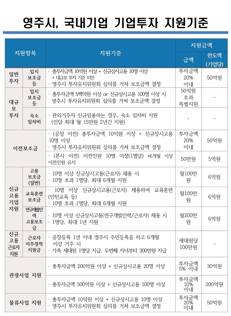 박남서 영주시장은 “이번 조례 개정으로 타 지자체와 차별화된 투자유치 환경을 조성하여 지역 경제가 더욱 활성화될 것”이라며, “앞으로도 기업들이 투자하기 좋은 환경을 지속적으로 조성해 활력 있는 지역 경제를 구축하겠다”고 밝혔다.