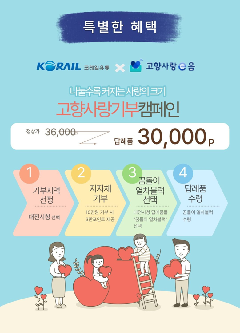 전일홍 문화예술관광국장은 “지역 아이콘과 철도의 만남을 통해 지역 재정에 기여하고, 고향사랑기부 문화 확산에 힘을 보태길 기대한다”라며 “대전엑스포의 기억과 꿈돌이의 친근한 매력이 철도 팬과 가족 단위 고객 모두에게 특별한 선물이 될 것”이라고 말했다.