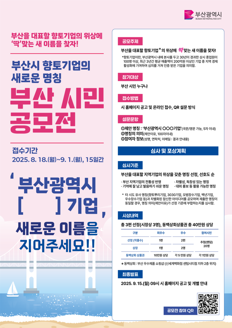 공모전은 관심 있는 시민 누구나 참여할 수 있으며, 큐알(QR) 간편 설문을 통해 ▲제안 명칭(부산광역시 '○○'기업, 국문/영문 가능, 글자 수 5자 이내) ▲명칭의 의미(100자 이내) ▲연락처를 작성해 제출하면 된다.
