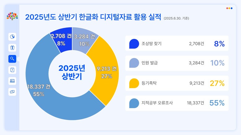 2021년부터 지난해까지 연차 사업으로 추진한 옛 토지대장 한글화 디지털 구축사업은 일제강점기 작성된 313만 6000장의 토지대장을 한글로 변환하고 디지털화한 것으로, 기록물의 노후화·훼손과 일본식 표현으로 인한 불편을 해소하고 도민의 재산권 회복 기반을 마련한 것이 핵심이다.
