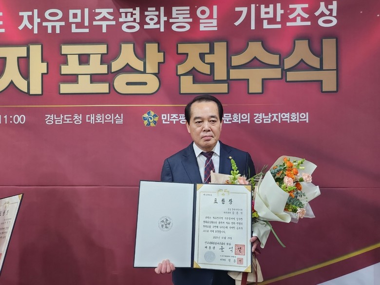 [세계타임즈]최성룡기자 = 마산범죄피해자지원센터 김종식 사무처장은 2024년 1월 12일 오전 11시 경남도청 대회의실(4층)에서 자유민주평화통일 기반조성 유공을 인정받아, 민주평화통일자문회의 의장(대통령) 표창을 전수받았다.
