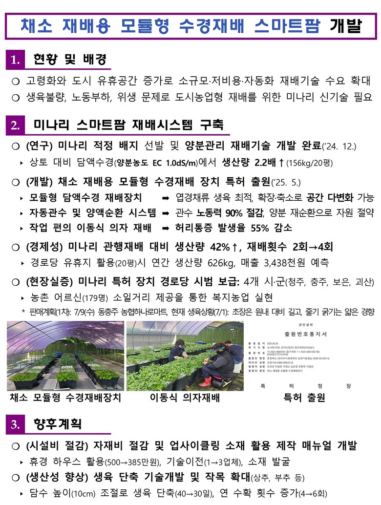 이 장치는 경로당, 소규모 텃밭, 체험농장 등에도 쉽게 설치할 수 있도록 설계돼, 500만원 이내 저비용으로 설치가 가능하다. 또한 모듈 단위 확장성과 유지보수 편의성도 갖췄다.