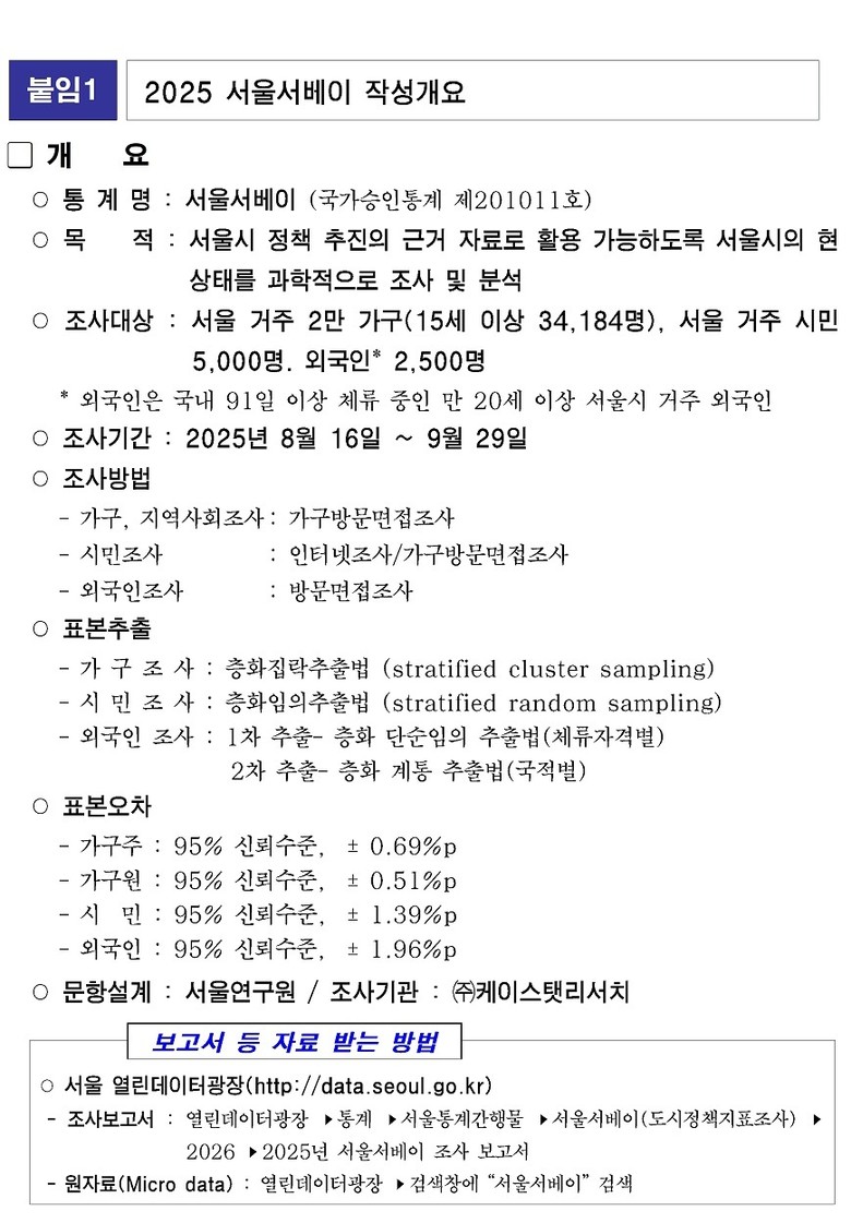 ‘서울서베이’는 사회환경 변화에 따른 시민의 생활상과 삶의 질, 가치관 변화를 파악하기 위해 2003년부터 매년 실시되는 조사로, 2025년에는 서울시민 2만 가구(15세 이상 가구원 34,184명), 시민 5,000명, 서울 거주 외국인 2,500명을 대상으로 진행됐다.