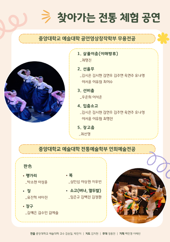 이번 공연은 중앙대학교 RISE사업단과 연계한 생활 속 평생학습관 운영 활성화 사업의 일환으로, 어린이와 시민이 전통문화를 보다 쉽고 친근하게 접할 수 있도록 기획됐다.