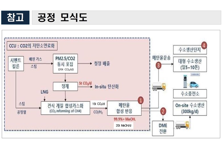 실증설비는 하루 20톤 규모의 CO2 포집시설과 메탄올* 생산시설로 구성되어 있으며, 시멘트 소성로에서 발생한 CO2를 포집·정제해 합성가스로 개질하고 이를 메탄올로 전환하는 통합공정으로 운영될 예정이다. 특히 시멘트 산업의 고온 폐열을 열원으로 활용해 에너지 효율을 높였으며, 메탄올 전환 효율 70%, 순도 99.8% 이상을 달성할 수 있도록 설계됐다.