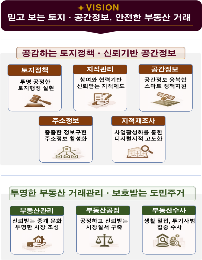 추진계획은 ▲투명하고 균형 잡힌 제도 운영으로 신뢰받는 토지행정 실현 ▲참여와 협력을 통한 신뢰받는 지적제도 정착 ▲공간정보 융·복합을 통한 스마트한 정책 지원 ▲촘촘한 주소정보 구현 및 주소정보 활성화 추진 ▲사업활성화를 통한 디지털지적 고도화 ▲신뢰받는 중개 문화와 투명한 부동산 시장 조성 ▲공정하고 신뢰받는 시장질서 구축 ▲생활밀접, 투기사범 집중수사 등 8대 전략을 바탕으로 한 92개 세부 이행과제로 구성됐다.