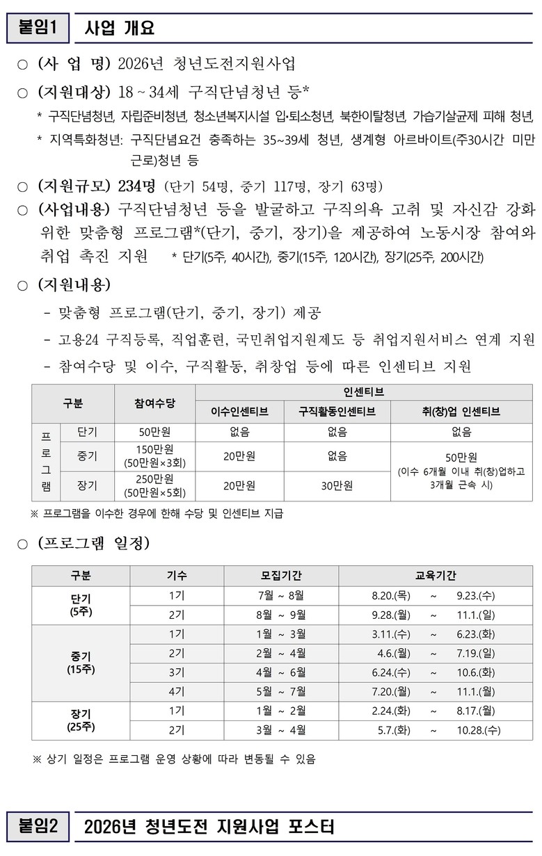 청년도전지원사업은 자신감 회복이 필요한 구직단념청년* 등을 대상으로 맞춤형 프로그램을 제공하여 마음 회복과 구직 의욕 고취, 노동시장 참여 및 취업 촉진을 지원하는 사업이다.