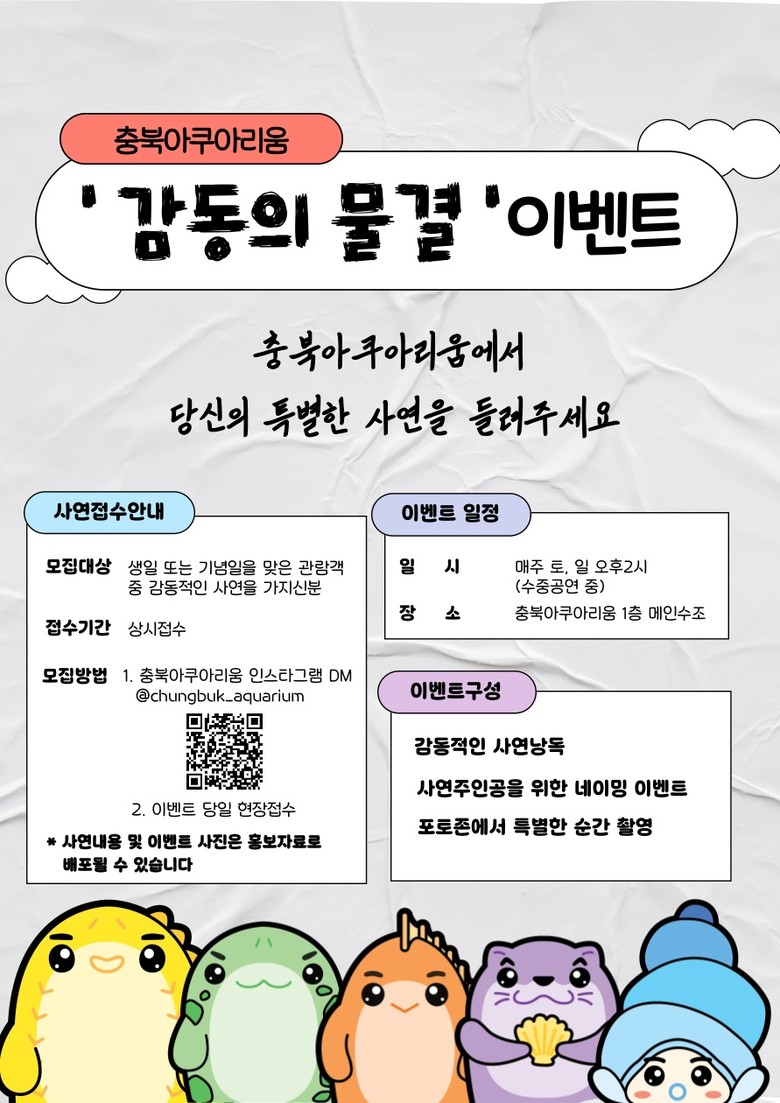 한편, ‘감동의 물결’ 이벤트 사연 신청은 충북아쿠아리움 인스타그램 또는 현장 접수를 통해 상시 모집 중이며, 누구든지 신청이 가능하다.
