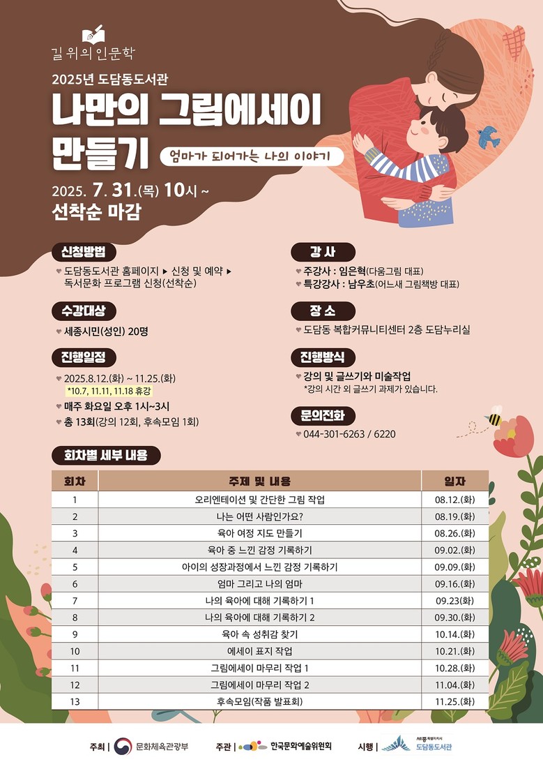 이에 도담동도서관은 내달 12일부터 11월 25일까지 총 13회차에 걸쳐 ‘나만의 그림에세이 만들기’ 강좌를 통해 육아 과정에서 나타나는 양육자들의 감정을 깊이 탐색하고 글과 그림으로 표현하는 시간을 갖는다.