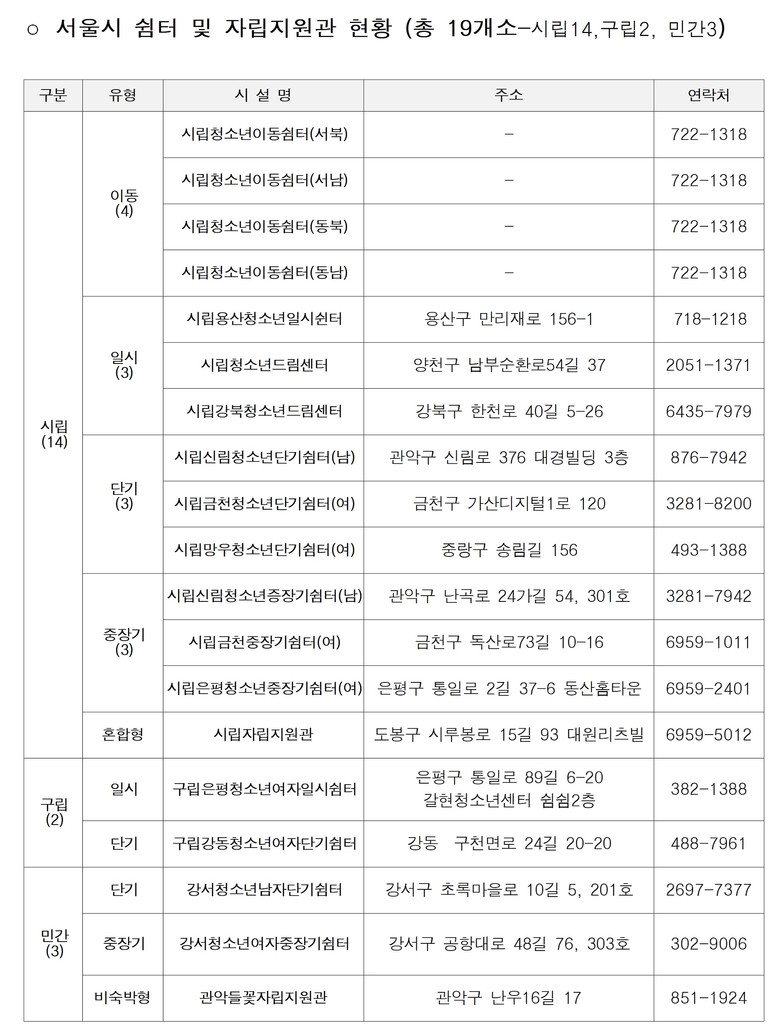한편 서울시는 가정 밖 청소년 보호를 위해 현재 총 17개 쉼터와 2개 자립지원관을 운영하며 상담・주거・학업・자립 등을 지원해 청소년이 건강하게 가정・학교・사회로 복귀하도록 돕고 있다.