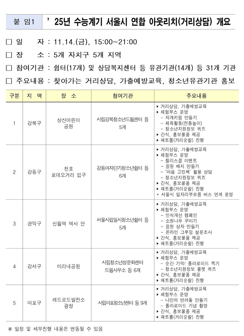 이번 5차 연합 거리상담은 14일(금) 오후 3시부터 9시까지 청소년 유동 인구가 많은 ▴강북구 상산어린이공원 ▴강동구 천호로데오거리 ▴관악구 신림역사 안 ▴강서구 미리내공원 ▴마포구 홍대 레드로드 광장 5곳에서 진행된다.