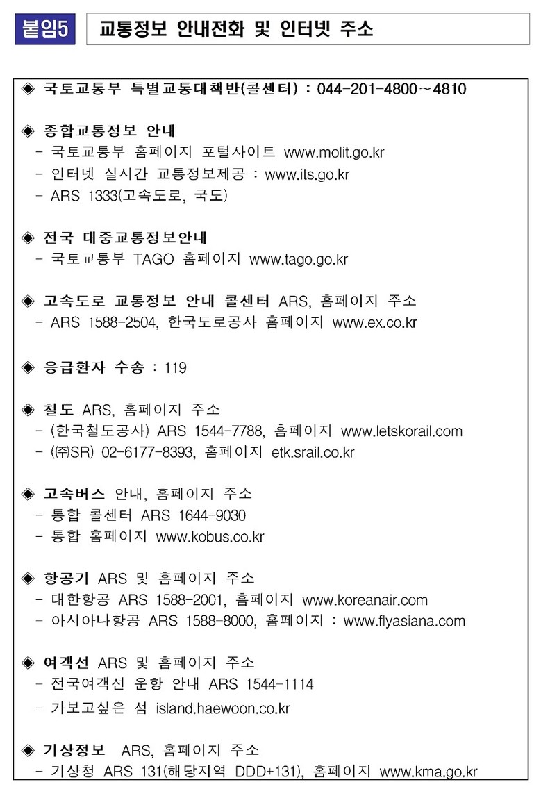 ▲응급의료체계 구축 및 안전 교통 대책으로는 연휴 기간 중 문 여는 병·의원과 약국을 지정·운영하고, 설 특별교통대책 상황실을 운영해 고속·시외·시내버스 및 택시 등 대중교통을 증회 운행하고, 교통혼잡·우회 정보 제공 등을 통해 교통량 분산을 유도한다. 또한, 지방도와 교통안전 시설물 집중 정비도 병행할 예정이다.