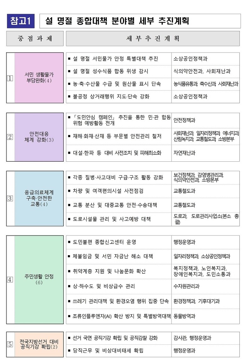 이번 대책은 ▲서민 생활물가 부담완화 ▲안전대응체계 강화 ▲응급의료체계 구축·안전한 교통 ▲주민생활 안정 ▲전국지방선거 대비 공직기강 확립 등 5개 분야 19개 세부과제로 구성됐다. 도는 도민 모두가 편안한 명절을 보낼 수 있도록 도와 시군 간 유기적인 협력체계를 구축해 추진할 방침이다.