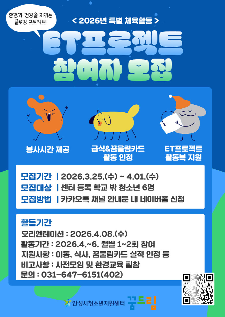 이번 ‘ET프로젝트’는 지역사회 내 플로깅(Plogging) 활동을 통해 걷거나 뛰며 쓰레기를 줍는 환경정화 프로그램이다. 청소년들이 일상 속 운동과 환경보호를 보다 쉽고 즐겁게 경험할 수 있도록 기획되었으며, 안성시환경보호센터와 연계하여 전문적인 환경교육과 함께 버려지는 자원을 재활용하는 양말목 공예 체험도 진행될 예정이다.