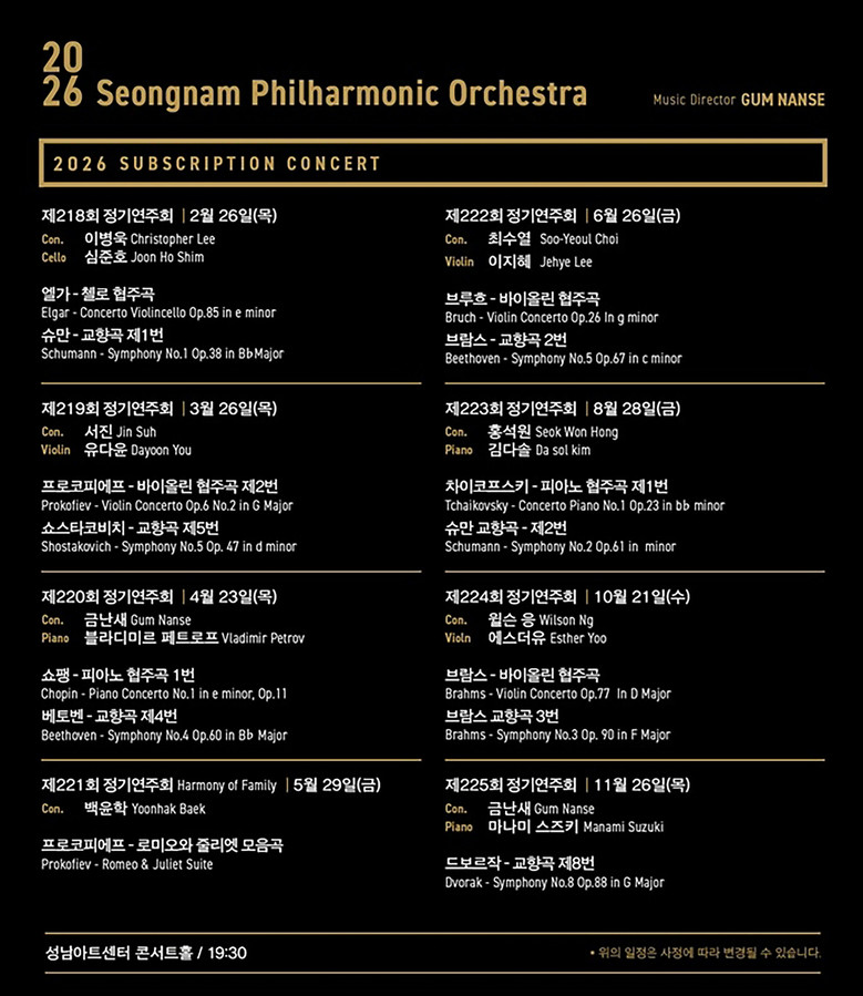 2026년 총 8회 정기공연 라인업을 확정하고, 1월 12일(월) 오후 2시 시즌권을 놀(NOL) 티켓을 통해 오픈한다. 성남시향의 예술총감독 금난새 지휘자를 비롯하여 이병욱, 서진, 백윤학, 최수열, 홍석원, 윌슨 응의 지휘와 첼리스트 심준호, 바이올리니스트 유다윤, 피아니스트 블라디미르 페트로프, 바이올리니스트 이지혜, 피아니스트 김다솔, 바이올리니스트 에스더유, 피아니스트 마나미 스즈키 등의 화려한 협연자를 초청하여 올해 최고의 정기연주회를 마련한다.