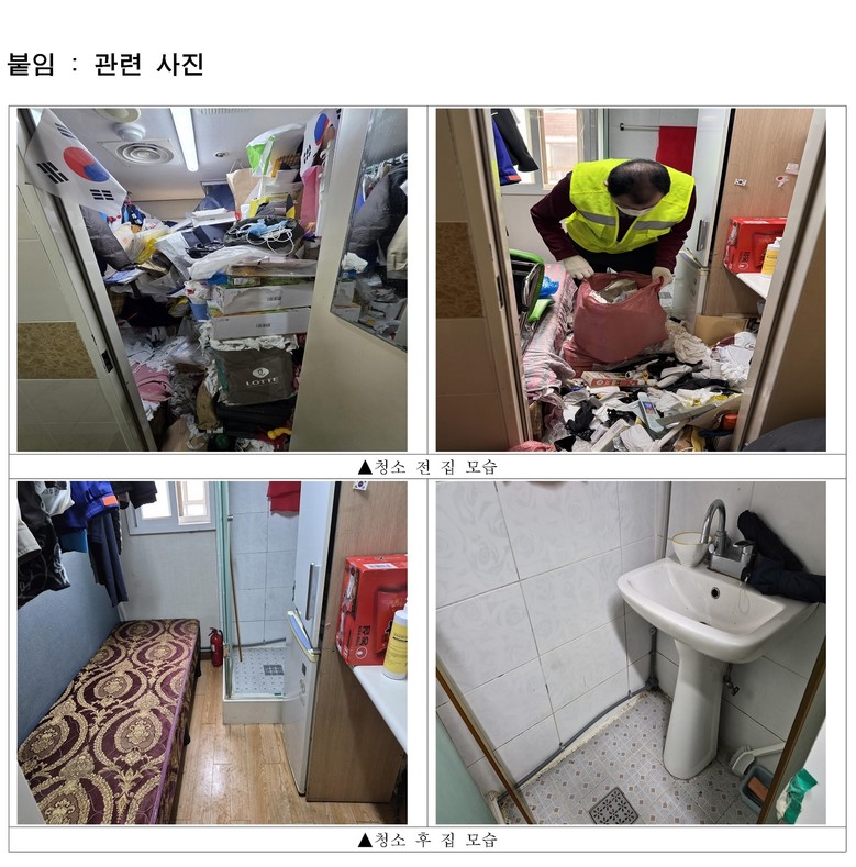 사회복지 담당 공무원은 어르신을 수차례 설득해 쓰레기 청소에 대한 동의를 얻었고, 이후 집 안을 가득 채운 약 1톤의 쓰레기를 수거했다. 이후 방역작업까지 마무리하며 위생과 안전을 확보했다.