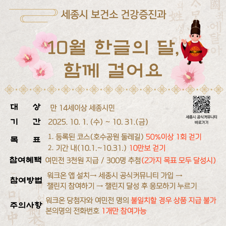 참여 방법은 본인 명의 휴대전화에 ‘워크온’ 앱을 설치한 뒤 ‘세종시공식커뮤니티’에 가입하고, ‘10월 한글의 달 함께 걸어요’ 걷기 도전을 신청하면 된다.