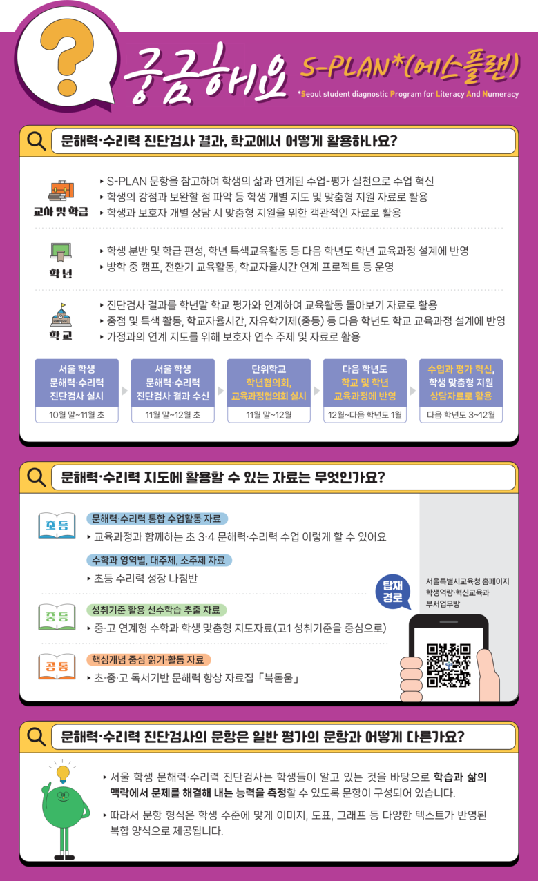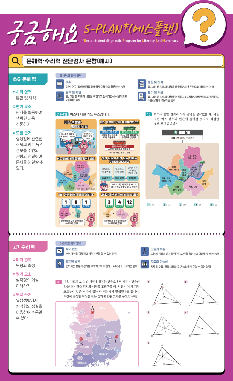 서울 학생 문해력·수리력 진단검사(에스플랜, S-PLAN)는 미래학력 및 여러 교과를 학습하는 데 기반이 되는 범교과적이며 도구적 기능을 갖는 기초소양으로서의 문해력과 수리력을 진단하는 검사이다