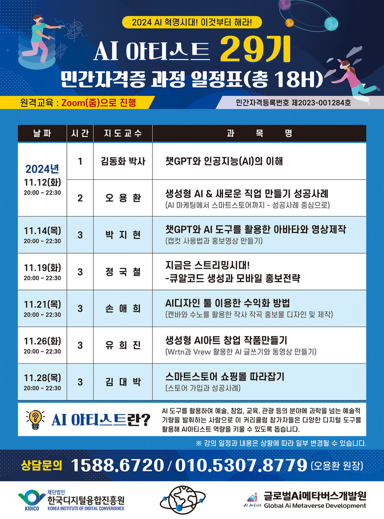 한편 한국디지털융합진흥원의 AI 아티스트 29기 과정은 AI 기술을 배우고 경제적 자유를 얻을 수 있는 방법을 탐색하는 과정으로 이번 과정을 통해 AI 시대의 주인공이 되고, 더 나은 미래를 향한 도전에 참여하실 분은 이래 1588-6720으로 문의하시거나 한국디지털융합진흥원 및 글로벌AI메타버스개발원 홈페이지를 방문하시면 된다.