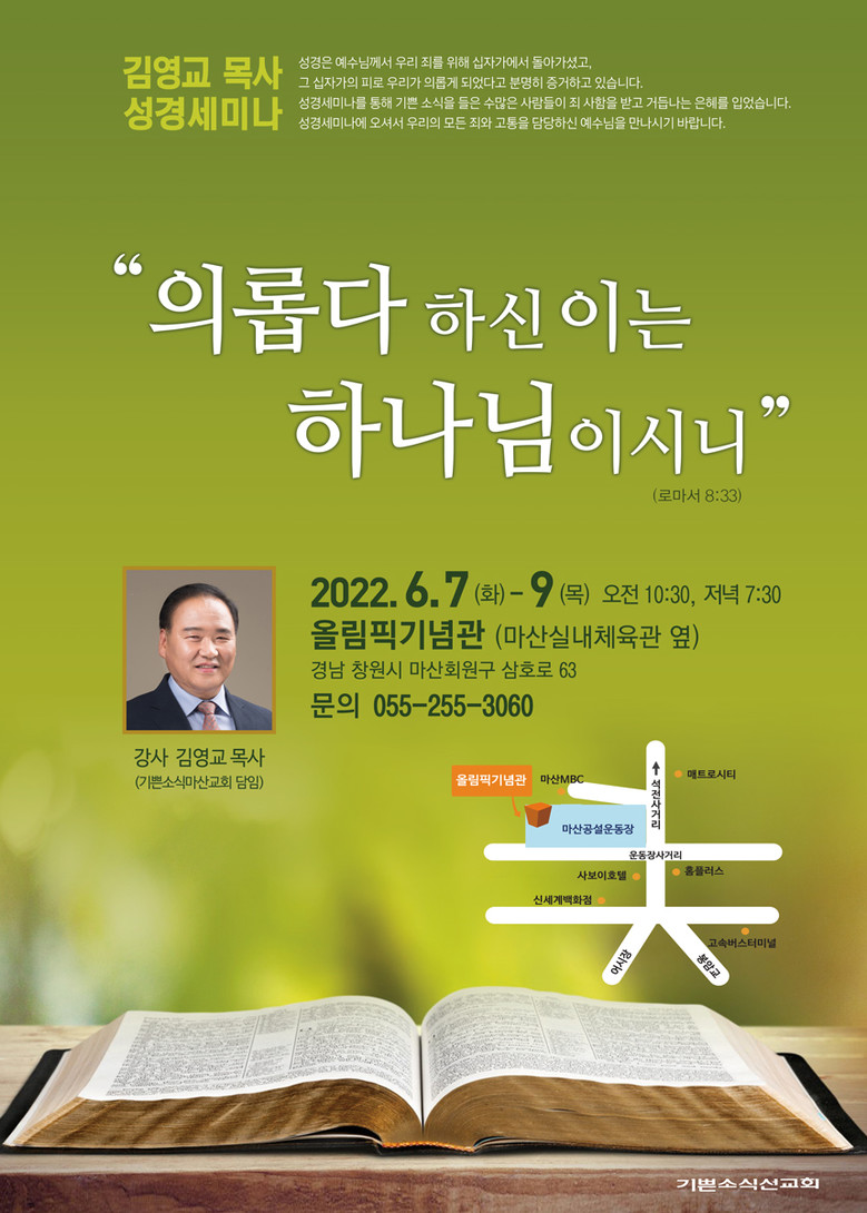 [세계타임즈]최성룡기자 = 기쁜소식마산교회는 2022년 6월 7일(화)부터 9일(목)까지 3일간 ‘김영교 목사 성경 세미나’를 마산실내체육관 올림픽기념관에서 개최한다고 밝혔다.