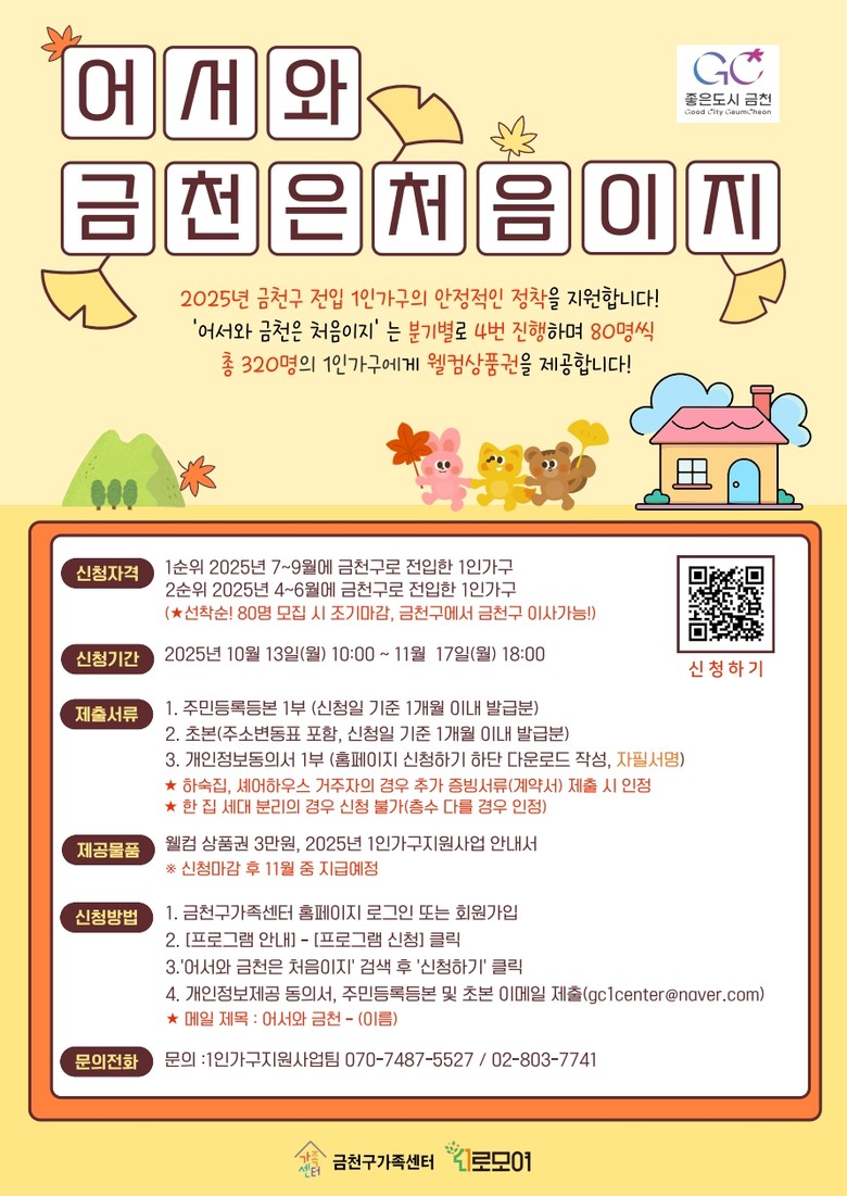 참가 신청은 금천구청 누리집, 1인가구 누리집, 금천구 가족센터 누리집, GS25 내 1인가구 지원사업 홍보존 ‘1인가구 나랑노랑’ QR코드를 통해 진행할 수 있다.