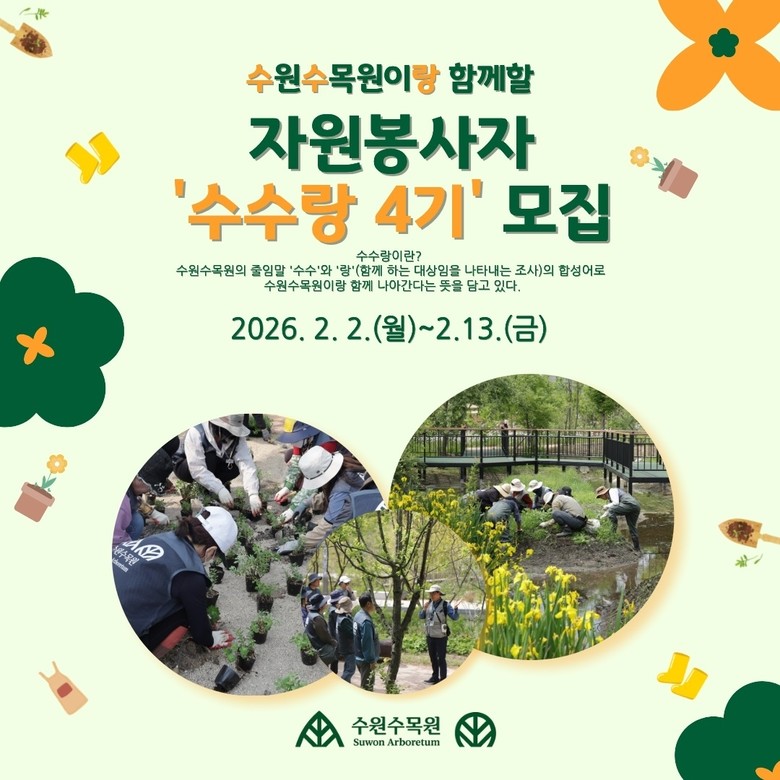 ‘수수랑’은 수원수목원의 줄임말 ‘수수’와 함께함을 뜻하는 ‘랑’이 결합된 이름으로, 시민이 수목원 운영에 직접 참여하는 자원봉사 프로그램이다.