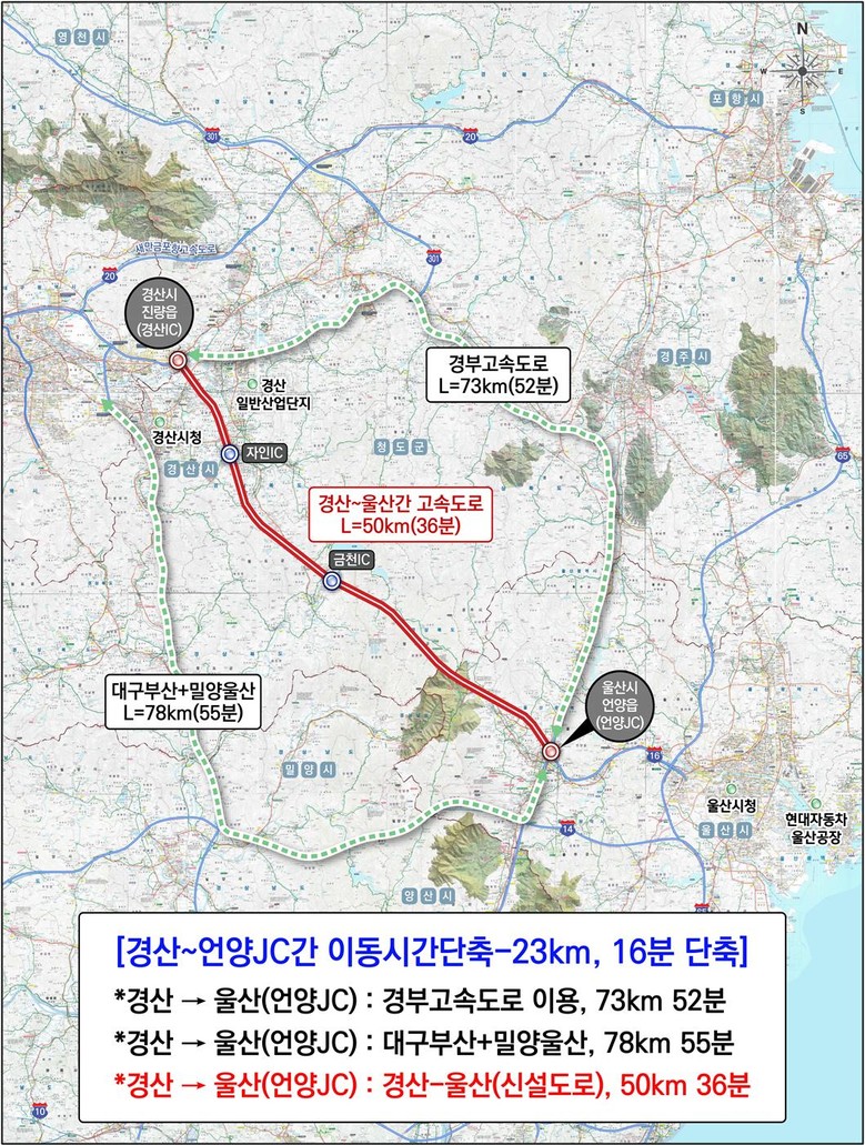 ‘경산~울산 고속도로’는 경산시 진량읍에서 울주군 언양읍을 잇는 총연장 50㎞ 규모의 고속도로를 신설하는 사업으로, 지금까지 자동차 부품 산업이 집적된 경산시에서 울산광역시까지의 물류 이동은 대부분 신대구부산고속도로를 이용했다.