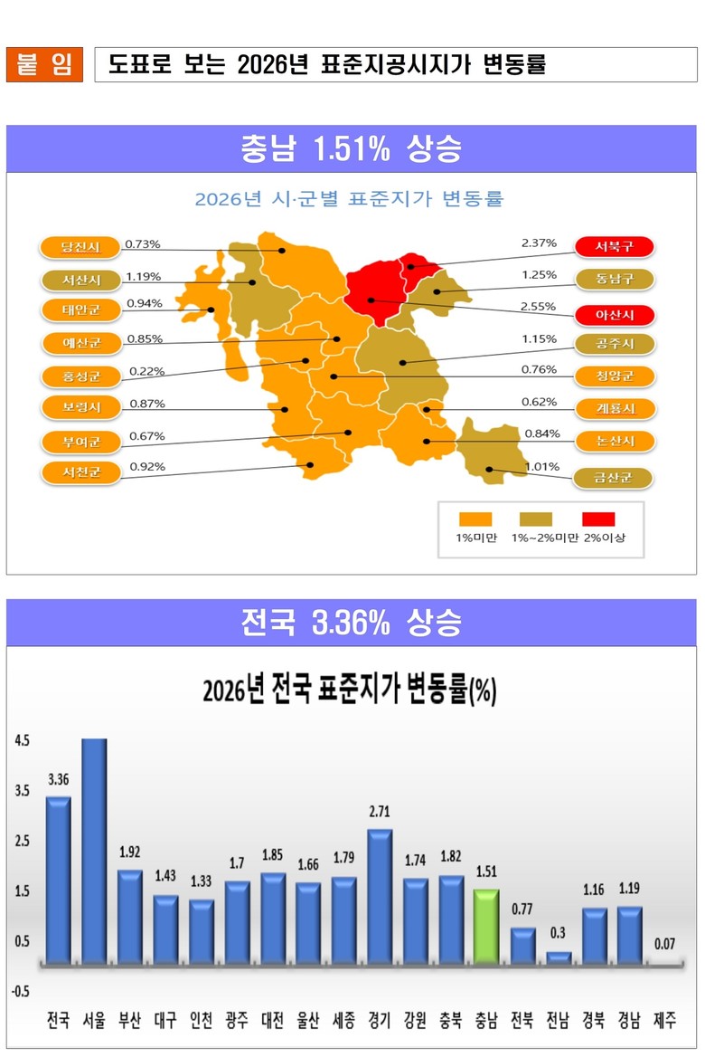 충남의 변동률은 지난해 1.44%에서 올해 1.51%로 상승했으며, 천안·아산 지역을 중심으로 각종 개발사업이 증가한 영향으로 분석된다.