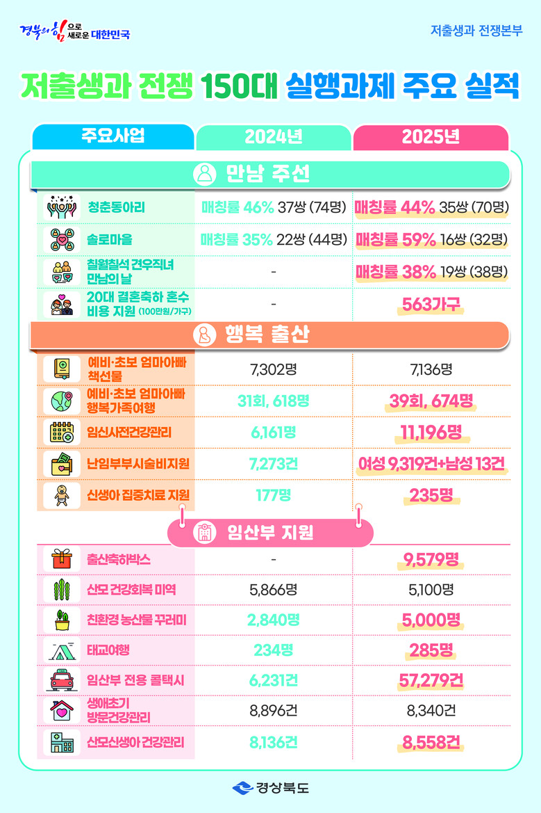 이철우 경상북도지사는 “2025년은 저출생과 전쟁이 구호를 넘어 도민의 일상에서 실제 변화를 만든 해였다. 만남·출산·돌봄·주거·일과 삶의 균형 전반에서 현장의 체감도가 분명히 높아졌고, 아이를 키우는 부담을 사회가 함께 나눈다는 인식 변화도 나타나고 있다. 2026년에는 선택과 집중을 통해 효과가 검증된 정책은 더 키우고, 중복되거나 체감도가 낮은 과제는 과감히 정비하겠다”며 “경북은 AI와 신기술을 결합한 돌봄·교육 혁신, 지역 공동체 회복을 통해 대한민국 인구정책의 새로운 해법을 현장에서 증명해 나가겠다.”라고 강조했다.
