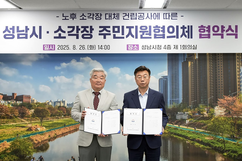| ▲ 2025년 8월 26일 시청 제1회의실에서 열린 ‘노후 소각장 대체 건립 공사 협약식’ 때 신상진 성남시장(오른)과 김재성 성남시 환경에너지시설 주민지원협의체 위원장(왼) |