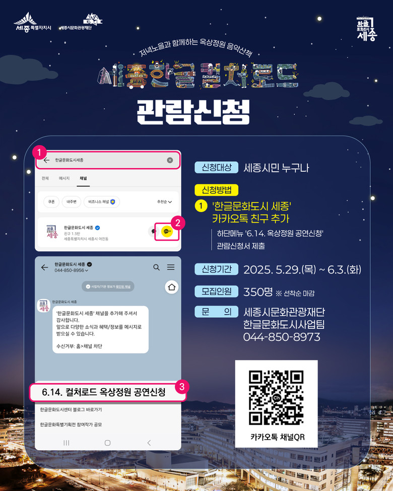 시는 오는 29일부터 내달 3일까지 카카오채널 ‘한글문화도시 세종’(pf.kakao.com/_xauBxnn)을 통해 참가자 350여 명을 선착순 모집하고 내달 4일 개별 문자로 당첨자를 통보할 계획이다.