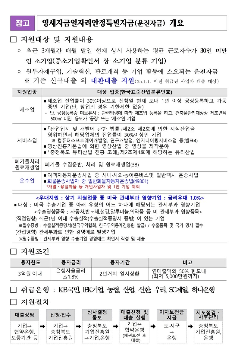 [충북 세계타임즈=이현진 기자] 충북도는 도내 중소기업의 자금난 해소와 경영 안정을 위해 2025년 중소기업육성자금 계획 변경 및 2회추경에 추가 예산 확보를 통해, 영세기업일자리안정특별자금 100억을 융자지원*한다고 밝혔다.