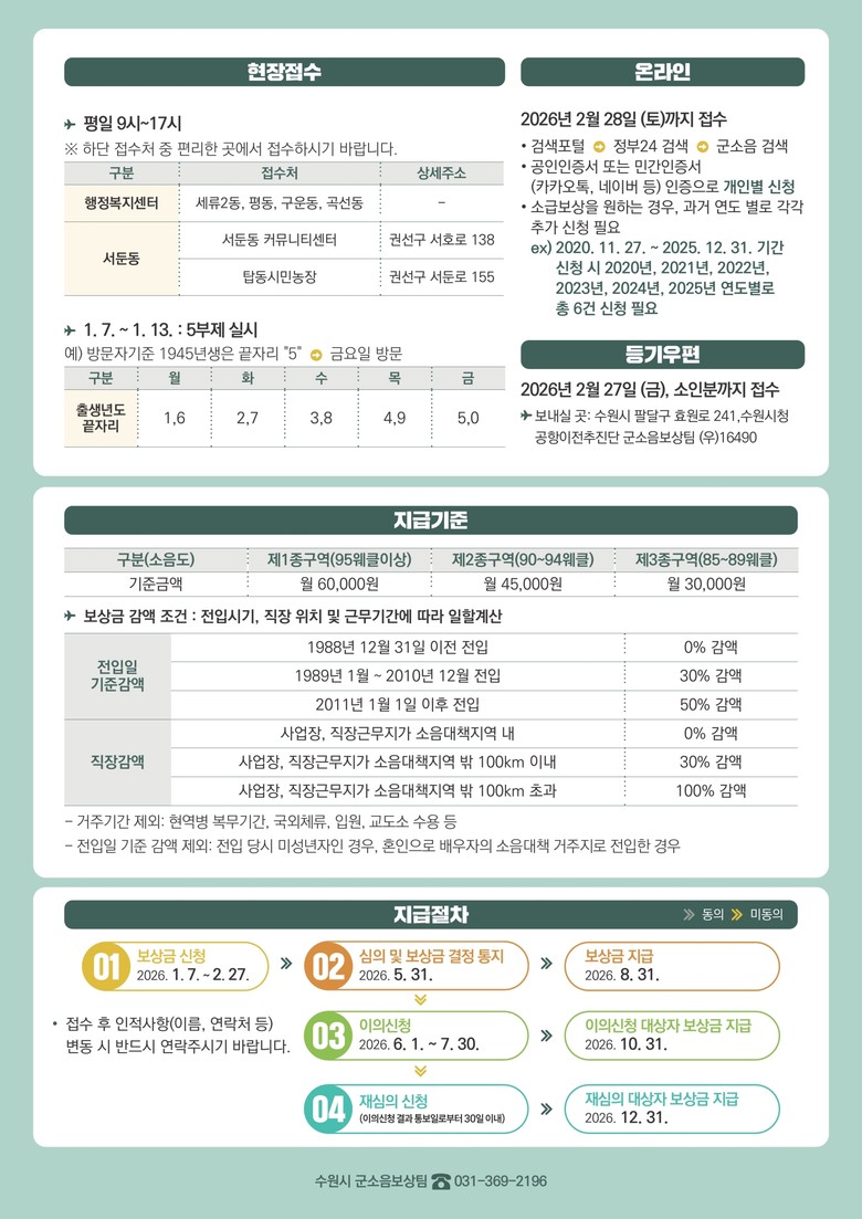 등기 우편 신청은 ‘수원시 팔달구 효원로 241, 수원시청 공항이전추진단 군소음보상팀’으로 구비 서류를 보내면 된다.