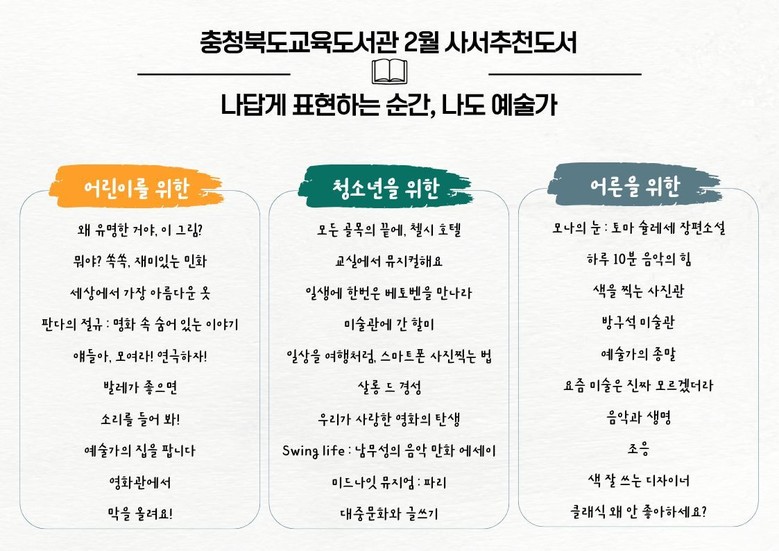 [충북 세계타임즈=이현진 기자] 충청북도교육청 직속기관 교육도서관(관장 노재경)은 <나답게 표현하는 순간, 나도 예술가>를 주제로 2026년 언제나 책봄! 열두 달 북큐레이션 2월 사서추천도서 30권을 선정했다.