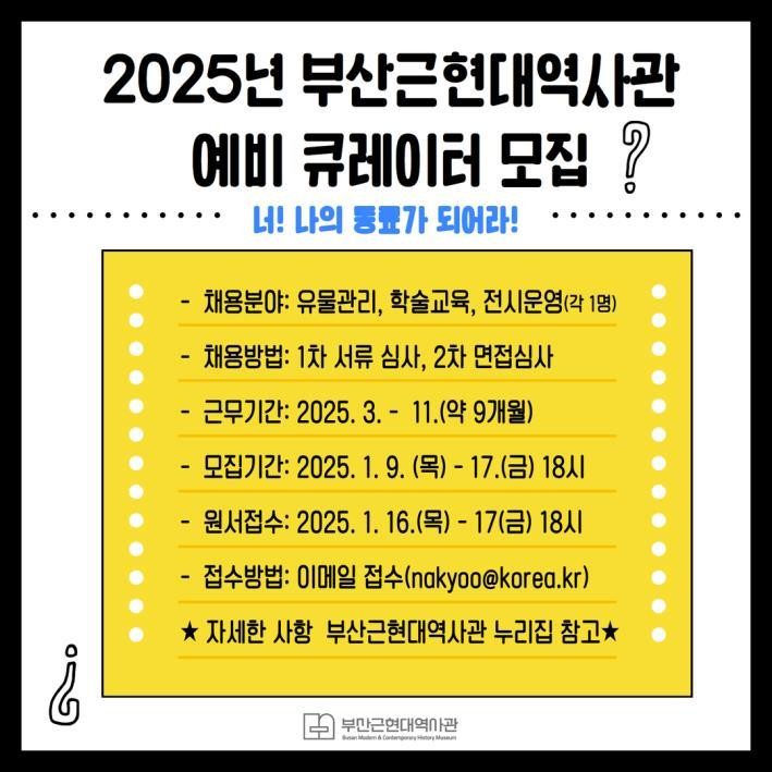 김기용 부산근현대역사관장은 “부산근현대역사관은 근현대사를 전문적으로 다루는 부산의 대표 박물관으로서 앞으로 큐레이터를 꿈꾸는 청년층의 일자리 창출을 위해 노력하고 있으며, 관련 학과를 졸업한 청년들이 관심을 가지고 예비 큐레이터 공개모집에 많은 지원을 부탁드린다”라고 전했다.
