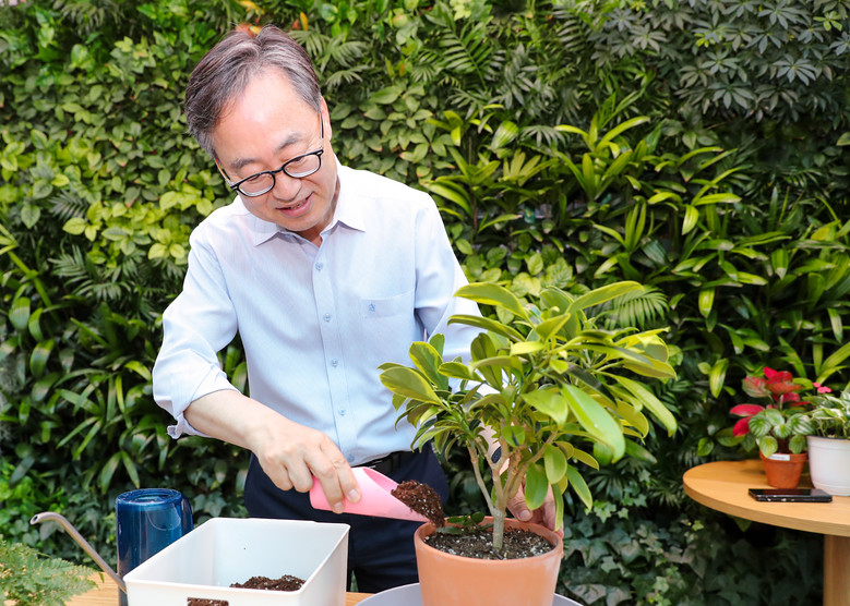 | ▲ 유성훈 금천구청장이 금천정원지원센터에서 화분에 흙을 채워주며 식물을 돌보고 있다 |