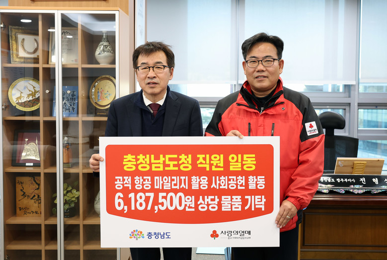 [충남 세계타임즈=이현진 기자] 충남도가 공적 항공마일리지를 활용해 마련한 생활용품을 충남사회복지공동모금회에 기탁하고 따뜻한 지역사회 만들기에 동참했다.