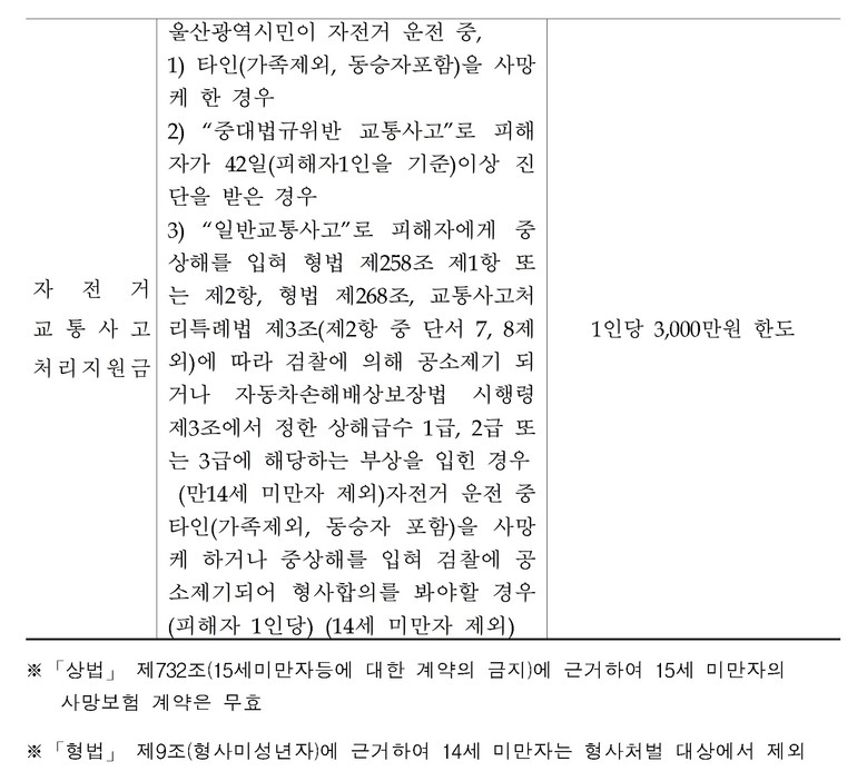 또한, 자전거 운전 중 타인을 사상케 하여 벌금을 부담해야 하는 경우 사고 당 2,000만 원, 변호사 선임비용 200만 원, 교통사고 처리지원금 3,000만 원 한도 내에서 지원받을 수 있다.
