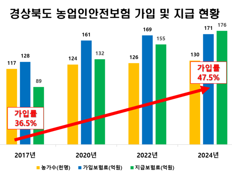 경상북도는 2017년부터 농업인 안전 보험 가입을 지원해 왔으며, 매년 가입률은 꾸준히 증가하고 있으며, 최근에는 보장 범위가 큰 ‘산재형’ 상품에 관한 관심이 높아지면서, 가입도 증가하는 추세이다.