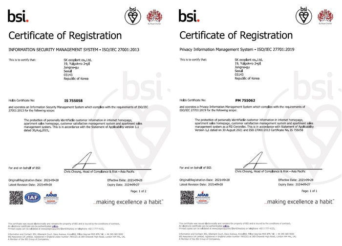 한영호 SK에코플랜트 CISO(정보보호최고책임자)겸 CPO(개인정보보호최고책임자)는 “이번 ISO 인증을 취득하면서 글로벌 시장 속 발주처의 요구사항을 충족시키고 신뢰도 향상에도 기여할 것으로 기대한다”며 “앞으로도 구성원과 이해관계자의 소중한 개인정보보호에 최선을 다하며 ESG 경영을 적극 실천해 나갈 것”이라고 말했다.