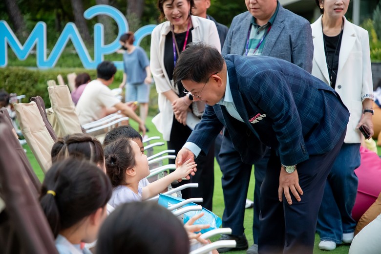 | ▲ 박강수 마포구청장이 엄빠랑 영화광장 행사에 참여한 어린이들과 인사를 하고 있다. |