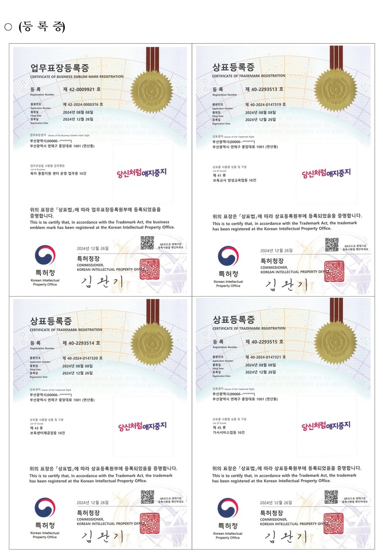 시는 출생부터 책임돌봄, 특화된 양육·돌봄·교육 정책을 모두 담은 「당신처럼 애지중지」의 취지와 상징성을 적극 활용하고자 업무표장과 상표등록을 추진했으며, 지난해 8월 특허청에 업무표장과 상표권(제41류, 제43류, 제45류) 등록을 출원해 지난 12월 26일 등록을 마쳤다.
