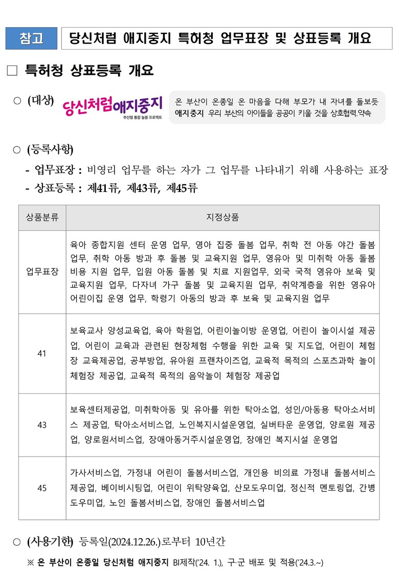 박형준 시장은 “이번 「당신처럼 애지중지」 브랜드의 상표와 업무표장 등록은 출생부터 육아와 돌봄, 교육 등 다양한 정책을 모아 혁신적으로 브랜드화해 '온 부산이 온종일 온 마음을 다해 아이 낳고 키우고 교육하기 좋은 도시'를 조성하기 위한 것”이라고 강조했다.