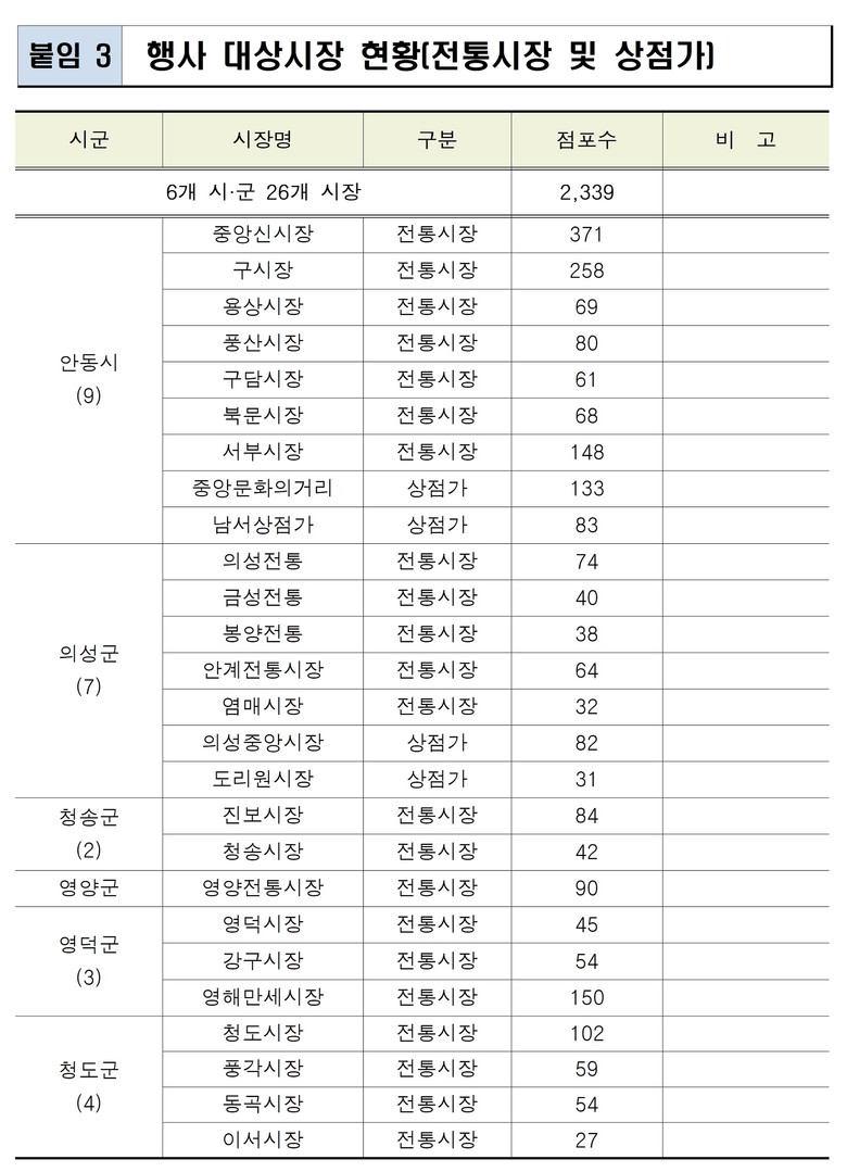 - 안동, 의성, 청송, 영양, 영덕, 청도6개 시군 26개 전통시장 대상 -