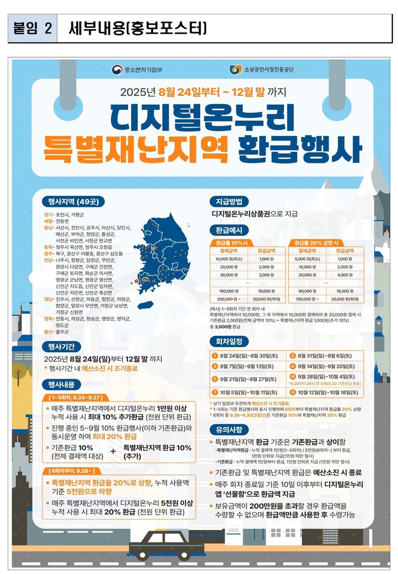 행사 기간은 8월 24일부터 12월 말까지이며, 환급 대상 지역은 특별재난지역으로 지정된 안동시, 의성군, 청송군, 영양군, 영덕군, 청도군 26개 전통시장과 상점가이다.