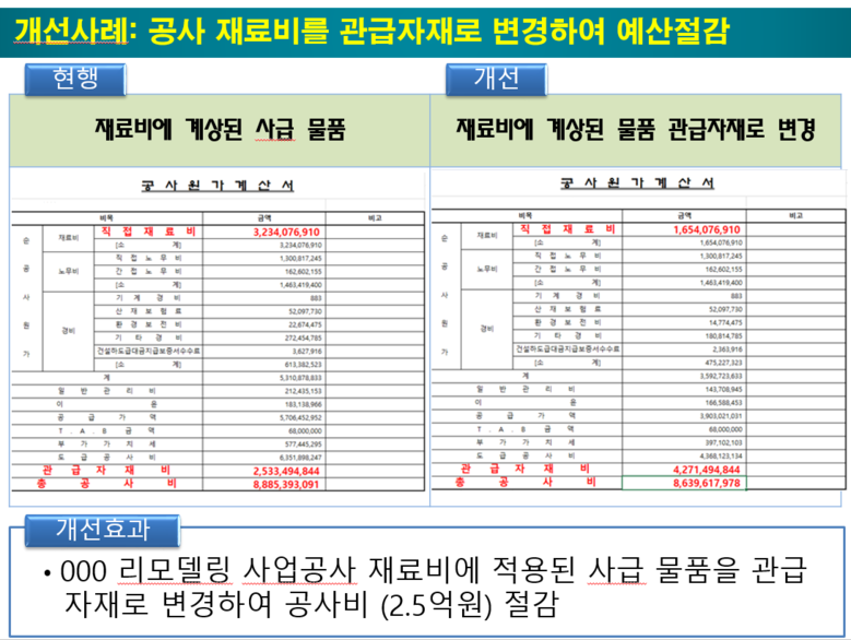 ○ ‘다’ 리모델링 공사와 관련된 재료비에 포함된 사급 물품을 관급자재로 변경해 일반관리비 및 경비 등의 항목에서 2억 5천만 원의 예산을 아꼈다.
