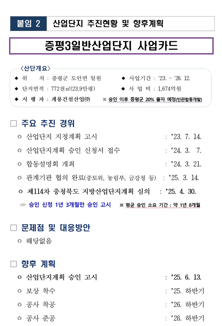 증평3일반산업단지는 계룡건설산업㈜에서 총사업비 1,674억 원을 투입하여 추진하는 산업단지로 ’26년 상반기까지 보상을 완료하고 하반기에 착공하여 ’28년 준공을 목표로 추진할 계획이다.
