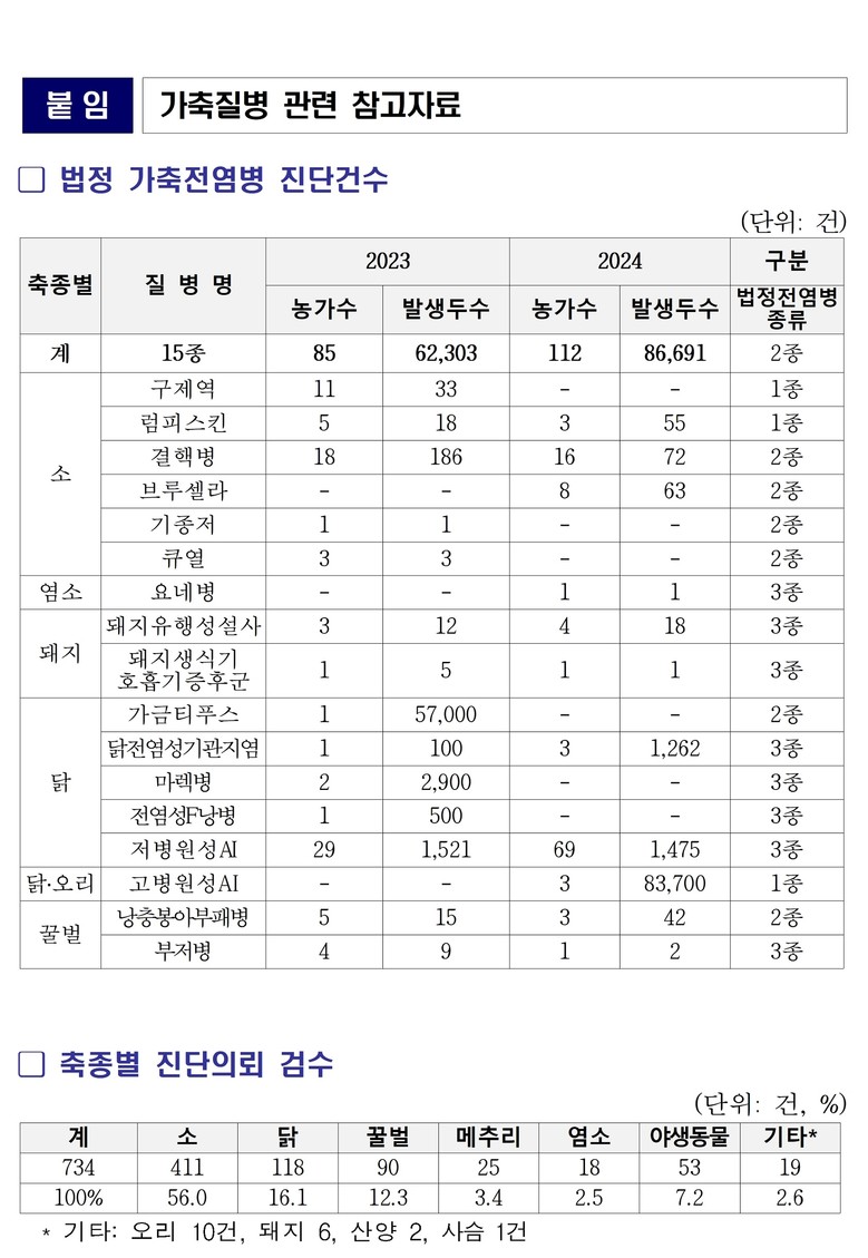 2024년 동물위생시험소로 의뢰된 가축 질병 진단 요청은 734건으로 주요 축종은 소와 닭, 꿀벌 등 이었다. 소는 411건으로 가장 높은 비율을 차지했으며, 닭과 꿀벌은 각각 118건 및 90건으로 뒤따랐다. 기타 진단 항목으로는 메추리 25건, 염소 18건, 야생동물 53건, 오리 10건, 돼지 6건, 산양 2건, 사슴 1건 등이 포함된다.