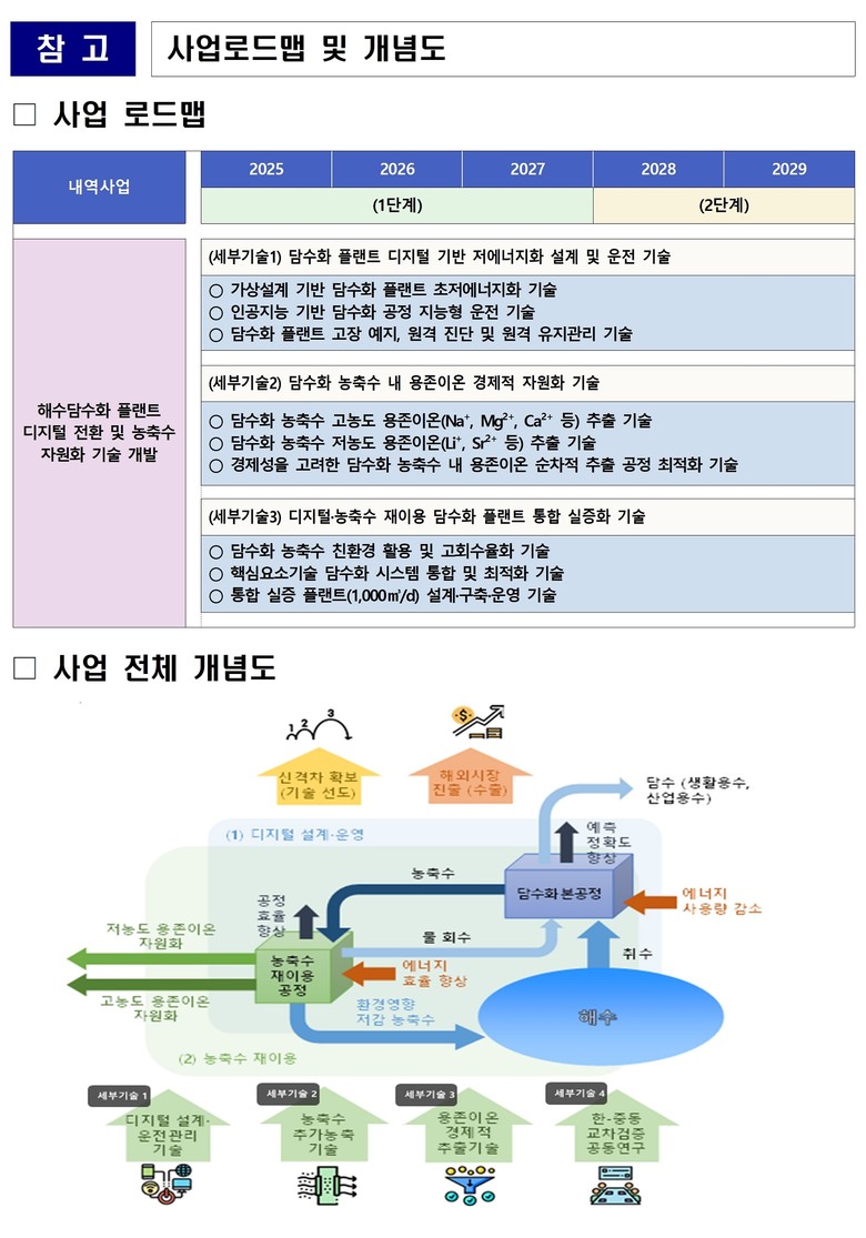 이번 실증사업은 올해부터 2029년까지 5년간 454억원(국비 354억원, 민자 100억원)을 투입해 컨소시엄(주관기관: ㈜포스코E&C) 공동으로 디지털 해수 담수화와 농축수 자원화 기술개발을 위한 실증 플랜트를 구축‧운영하는 것을 주요 내용으로 한다.