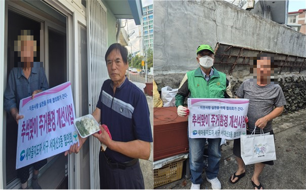 [서구 세계타임즈=이용우 기자] 부산 서구 새마을지도자 서대신3동 협의회(회장 이기우)는 지난 1일, 추석을 맞아 관내 취약계층 및 어르신 20세대를 방문해 안부를 확인하고, 주거 환경 개선을 위해 거주지 주변 방역과 쓰레기 청소를 실시하며 성품을 전달했다.